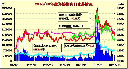 10月15日隔夜鄭棉沖高回落,今日早盤區(qū)間震蕩,日線形成小陰線。日內(nèi)近月成交量變化不大,遠(yuǎn)月成交溫和放大,持倉量增加。基本面情況:隨著熱帶風(fēng)暴Sergio向西德州移動(dòng),上周末期間該區(qū)域預(yù)計(jì)將出現(xiàn)降雨天氣,氣溫將降低,至周一降雨量可能將超過2.5厘米。本年度至今德州高原地區(qū)棉區(qū)已經(jīng)先后經(jīng)歷了干旱、不利降雨以及低溫等不利天氣影響。降雨天氣使戶外作業(yè)受阻,因此西德州部分棉區(qū)棉花采摘進(jìn)度緩慢。
