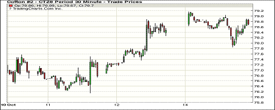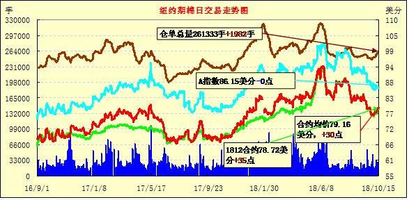 10月15日紐約期棉市場近漲遠(yuǎn)跌。1812合約結(jié)算價78.72美分,漲35點;1903合約結(jié)算價79.84美分,漲29點;1905合約結(jié)算價80.65美分,漲24點;1907合約結(jié)算價81.15美分,漲16點。其他合約下跌21-31點不等。當(dāng)日12月合約小幅高開,開盤后交易重心受支撐維持上行態(tài)勢,至當(dāng)日高點79.16美分處賣盤入場,交易重心有所回落,后買盤發(fā)力,市場受支撐再度回彈,最終以小幅上漲收盤。颶風(fēng)Michael對東南棉區(qū)棉花產(chǎn)量和質(zhì)量的影響程度,目前正處于評估過程中,但根據(jù)目前市場反饋來看,或?qū)p失慘重。另中美貿(mào)易爭端的走勢也引發(fā)市場持續(xù)關(guān)注。外圍美元指數(shù)下跌,小麥、玉米和大豆期貨上漲。周一美股齊下挫,三大股指均收跌。