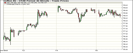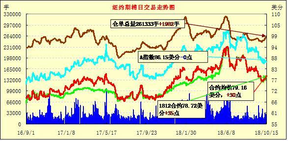 10月16日紐約期棉市場近跌遠漲。1812合約結(jié)算價78.33美分,跌39點;1903合約結(jié)算價79.78美分,跌6點;1905合約結(jié)算價80.65美分,不變。其他合約上漲2-12點不等。當日12月合約小幅高開,開盤后因缺乏有利支撐交易重心下行,低點處買盤發(fā)力,市場受支撐小幅走高,后受獲利了結(jié)盤壓力交易重心下行,至收盤處雖經(jīng)歷幾次震蕩,因支撐因素不足,最終以小幅下跌收盤。由于颶風Michael對棉花產(chǎn)量和質(zhì)量的影響仍處于定損中,其中以喬治亞州為甚,尚未有具體數(shù)據(jù)公布。目前市場普遍持觀望態(tài)度,現(xiàn)貨銷售進度減慢。另,美國中期選舉臨近,有分析指出最終選舉結(jié)果對中美貿(mào)易戰(zhàn)的走向?qū)⑵鸬椒浅V匾挠绊?。外圍美元指?shù)上漲,小麥、玉米和大豆期貨下跌。周二美股齊上漲,三大股指均漲勢收盤。