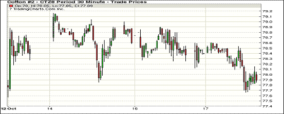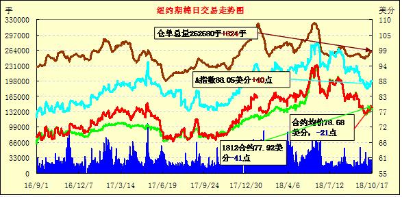 10月17日紐約期棉市場(chǎng)近月合約跌勢(shì)延續(xù)。1812合約結(jié)算價(jià)77.92美分,跌41點(diǎn);1903合約結(jié)算價(jià)79.44美分,跌34點(diǎn);1905合約結(jié)算價(jià)80.46美分,跌19點(diǎn)。當(dāng)日12月合約小幅高開(kāi),開(kāi)盤(pán)后交易重心維持震蕩態(tài)勢(shì),后賣(mài)盤(pán)入場(chǎng),市場(chǎng)承壓走低,因缺乏利好支撐,最終延續(xù)前一日跌勢(shì),以小幅下跌收盤(pán)。據(jù)估計(jì),颶風(fēng)Michael對(duì)喬治亞州棉花的影響可能在15.2-21.8萬(wàn)噸。但又有目前尚未有官方統(tǒng)計(jì)數(shù)據(jù)公布,市場(chǎng)各方仍處于持續(xù)關(guān)注和觀望狀態(tài)。另一方面,近日美元持續(xù)強(qiáng)勢(shì),對(duì)美棉現(xiàn)貨的銷(xiāo)售也會(huì)有所影響。外圍美元指數(shù)上漲,小麥、玉米和大豆期貨下跌。