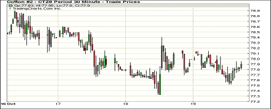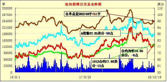 10月19日紐約期棉市場(chǎng)全面收跌。1812合約結(jié)算價(jià)77.92美分,跌13點(diǎn);1903合約結(jié)算價(jià)79.36美分,跌13點(diǎn);1905合約結(jié)算價(jià)80.45美分,跌10點(diǎn)。其他合約下跌6-14點(diǎn)。當(dāng)日12月合約小幅高開(kāi),開(kāi)盤(pán)后呈震蕩運(yùn)行態(tài)勢(shì),因缺乏有利支撐,交易重心走低,至當(dāng)日低點(diǎn)77.52美分處買盤(pán)發(fā)力,市場(chǎng)受支撐上行,但因上漲動(dòng)力不足,最終以小幅下跌收盤(pán)。根據(jù)美國(guó)農(nóng)業(yè)部最新發(fā)布的美棉出口數(shù)據(jù),上周簽約和裝運(yùn)量均出現(xiàn)明顯減少。同時(shí),中美貿(mào)易爭(zhēng)端尚未出現(xiàn)緩和趨勢(shì),引發(fā)市場(chǎng)擔(dān)憂。外圍美元指數(shù)下跌,大豆和玉米期貨下跌,小麥期貨漲跌互現(xiàn)。美股周五收盤(pán)漲跌不一,道指收漲,標(biāo)普和納指收跌。