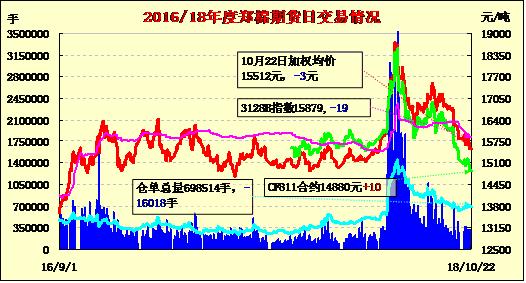 10月22日隔夜鄭棉盤整,今日早盤沖高后調(diào)整,隨后窄幅震蕩直至收盤,日線形成小陽(yáng)線。日內(nèi)成交量萎縮,持倉(cāng)量近減遠(yuǎn)增。基本面情況:海關(guān)總署最新數(shù)據(jù)顯示,2018年9月,我國(guó)出口紡織品服裝約266.09億美元,同比增加12.04%,環(huán)比減少1.64%。2018年1-9月,我國(guó)累計(jì)出口紡織品893.67億美元,同比增加10.12%;累計(jì)出口服裝1192.65億美元,同比增加0.53%。