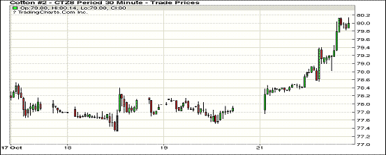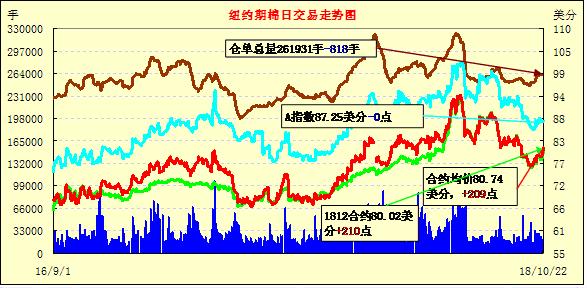 22日紐約期棉市場一改前一日跌勢,全面大幅收漲。1812合約結算價80.02美分,漲210點;1903合約結算價81.45美分,漲209點;1905合約結算價82.39美分,漲194點。其他合約上漲90-174點不等。當日12月合約小幅低開,整日呈震蕩上行態(tài)勢。開盤后交易重心圍繞78.40美分一線窄幅震蕩,后買盤入場,市場受支撐走高,至收盤處雖經歷幾次小幅震蕩,交易重心幾度出現小幅回落,但在美棉減產擔憂以及買盤支撐之下,最終仍以大幅上漲收盤。受颶風Michael影響較為嚴重的喬治亞和阿拉巴馬州,目前大幅減產預期越來越強烈,引發(fā)市場擔憂。此外近期西德州持續(xù)低溫多雨,也使該區(qū)域棉花質量問題成為市場另一隱憂。外圍美元指數上漲,大豆和玉米期貨上漲,小麥期貨下跌。美股周一收盤漲跌不一,標普和道指收跌,納指收漲。