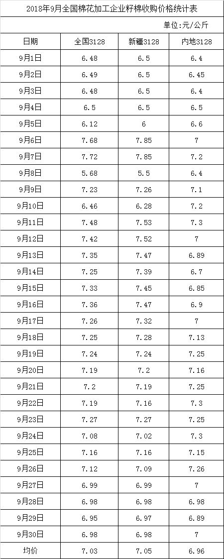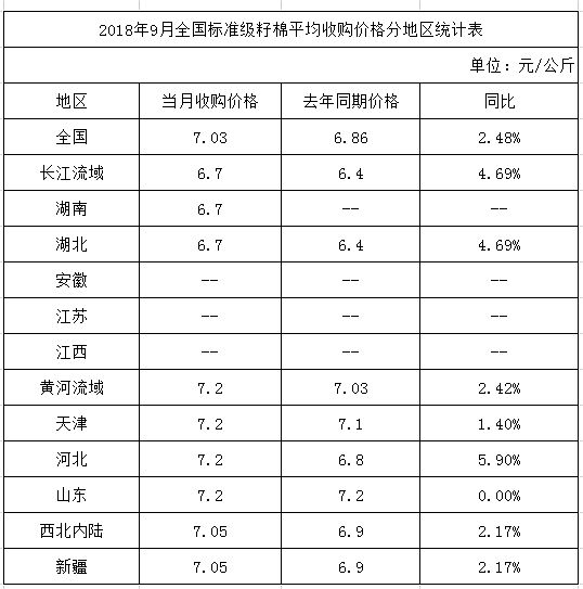9月,全國(guó)標(biāo)準(zhǔn)級(jí)籽棉平均收購(gòu)價(jià)7.03元/公斤,同比上漲2.48%。分區(qū)域看,新疆平均收購(gòu)價(jià)7.05元/公斤,同比上漲2.17%;長(zhǎng)江流域6.70元/公斤,同比上漲4.69%;黃河流域7.20元/公斤,同比上漲2.42%。新疆開秤價(jià)7.30元/公斤,較去年同期高0.20-0.30元/斤。