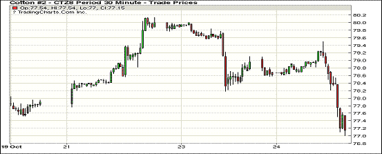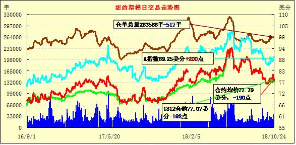 24日紐約期棉市場跌勢延續(xù)。1812合約結(jié)算價77.07美分,跌192點(diǎn);1903合約結(jié)算價78.87美分,跌183點(diǎn);1905合約結(jié)算價80.13美分,跌156點(diǎn)。其他合約下跌47-130點(diǎn)不等。當(dāng)日12月合約小幅高開,開盤后維持在78.50-79.00美分區(qū)間窄幅震蕩運(yùn)行,后買盤入場,市場受支撐走高,至當(dāng)日高點(diǎn)79.50美分處,受獲利了結(jié)盤壓力交易重心下行,因缺乏有利支撐,后跌勢加劇,最終延續(xù)前一日跌勢,最終以大幅下跌收盤。由于颶風(fēng)Michael對期棉價格的刺激作用遠(yuǎn)不及預(yù)期,有多頭資金撤離,導(dǎo)致漆期棉價格走低。此外,遲遲未有緩解跡象的中美貿(mào)易戰(zhàn),也成為揮之不去的“陰影”。外圍美元指數(shù)上漲,大豆、小麥和玉米期貨下跌。美股周三收盤,三大股指齊下挫。