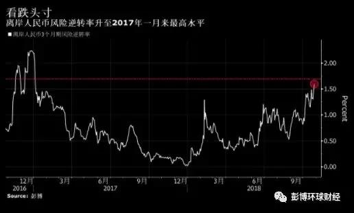 反映交易員對(duì)人民幣期權(quán)市場看跌情緒的離岸人民幣三個(gè)月期風(fēng)險(xiǎn)逆轉(zhuǎn)率周五飆升至2017年1月以來最高水平,說明押注人民幣下跌的市場需求攀升。