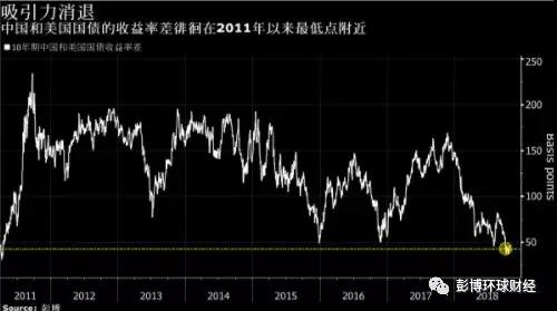 中國和美國10年期政府債券收益率差上周收窄至37個(gè)基點(diǎn),為2011年4月以來的最低水平。這使得人民幣計(jì)價(jià)的資產(chǎn)(如境內(nèi)債券)的吸引力降低,資本流入由此減少。