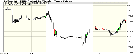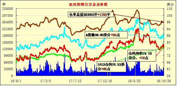 10月26日紐約期棉市場(chǎng)漲勢(shì)延續(xù)。1812合約結(jié)算價(jià)78.53美分,漲85點(diǎn);1903合約結(jié)算價(jià)79.82美分,漲86點(diǎn);1905合約結(jié)算價(jià)80.81美分,漲67點(diǎn)。其他合約上漲9-50點(diǎn)不等。當(dāng)日12月合約高位開(kāi)盤(pán),因缺乏有利支撐,開(kāi)盤(pán)后交易重心下行,至當(dāng)日低點(diǎn)77.11美分處買(mǎi)盤(pán)發(fā)力,市場(chǎng)受支撐走高,至收盤(pán)維持上漲態(tài)勢(shì),最終維持前一日上漲趨勢(shì)。據(jù)悉,颶風(fēng)Michael的定損報(bào)告尚未公布,但據(jù)有關(guān)保險(xiǎn)公司人士稱,喬治亞州損失慘重,多個(gè)面棉區(qū)被全部損毀,市場(chǎng)普遍觀望11月美國(guó)農(nóng)業(yè)部(USDA)月度供需平衡表是否會(huì)對(duì)美國(guó)棉花產(chǎn)量預(yù)期進(jìn)行調(diào)整。此外,西德州近期的頻繁降雨也引發(fā)市場(chǎng)持續(xù)關(guān)注。外圍美元指數(shù)上漲,大豆、小麥和玉米期貨下跌。美股周五震蕩收跌。