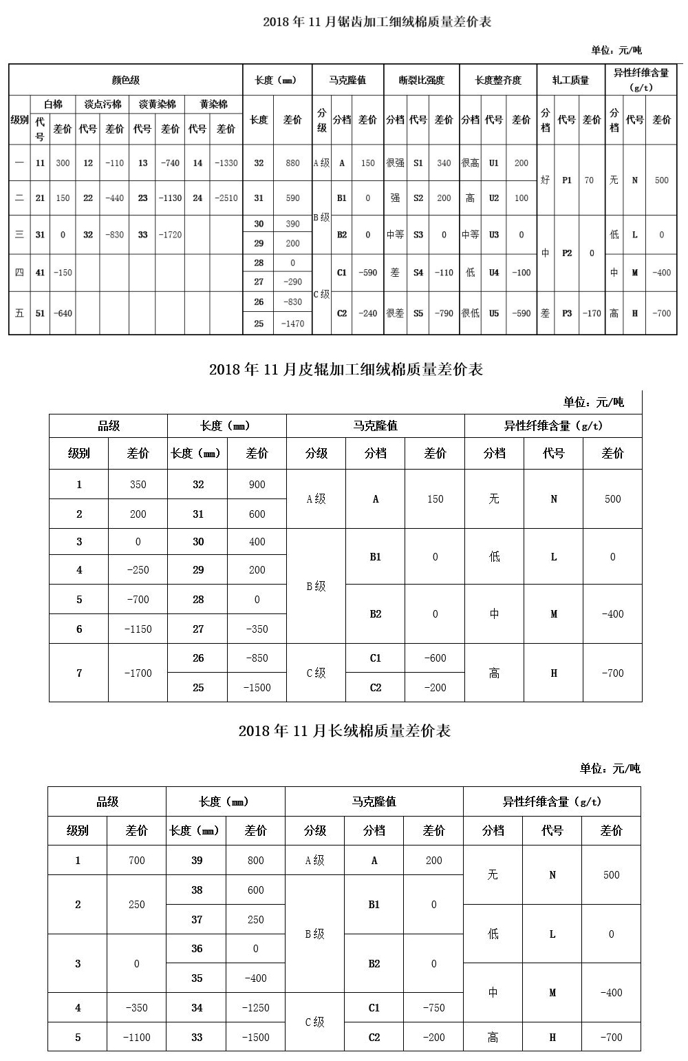 其余質(zhì)量指標(biāo)差價(jià)幅度以及《皮輥加工細(xì)絨棉質(zhì)量差價(jià)表》、《長(zhǎng)絨棉質(zhì)量差價(jià)表》保持不變。