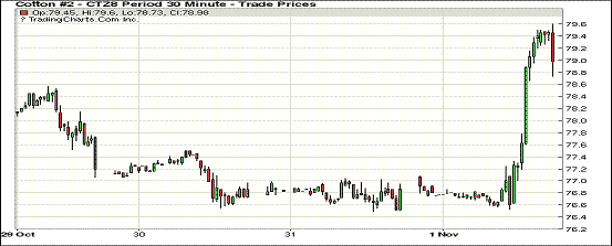 11月第一個(gè)交易日紐約期棉市場(chǎng)全面大幅收漲。1812合約結(jié)算價(jià)79.03美分,漲217點(diǎn);1903合約結(jié)算價(jià)80.48美分,漲218點(diǎn);1905合約結(jié)算價(jià)81.66美分,漲217點(diǎn);其他合約上漲138-212點(diǎn)不等。當(dāng)日12月合約小幅高開,開盤后因缺乏有利支撐交易重心走低,低點(diǎn)處買盤發(fā)力,市場(chǎng)受支撐上行;美棉出口周報(bào)發(fā)布后,因簽約和裝運(yùn)數(shù)據(jù)均低迷,交易重心承壓走低;但在強(qiáng)勢(shì)買盤的支撐之下,市場(chǎng)再度回彈,后至收盤處雖因獲利了結(jié)盤壓力略有回落,但最終仍以大幅上漲收盤。據(jù)美國農(nóng)業(yè)部(USDA),10.19-25日一周美國凈簽約出口2018/19年度陸地棉-11113噸(含新簽約14152噸,另取消25265噸前期訂單),較前周與近4周平均均大幅減少,創(chuàng)本年度新低;裝運(yùn)2018/19年度陸地棉24902噸,較前周減少21%,較近4周平均減少34%。凈簽約本年度皮馬棉5783噸;裝運(yùn)皮馬棉1111噸。凈簽約出口2019/20年度陸地棉21069噸,較前周減少35%。中美領(lǐng)導(dǎo)人圍繞貿(mào)易和朝鮮等問題通電話,特朗普稱交談富有成效,雙方均期待在G20峰會(huì)期間進(jìn)行更加深入的交談。同時(shí),美國多棉區(qū)近期深受降雨天氣困擾,棉農(nóng)普遍擔(dān)憂棉花產(chǎn)量和質(zhì)量受到不利影響。外圍美元指數(shù)下跌,大豆、小麥、玉米期貨上漲。美股連續(xù)三日收漲。
