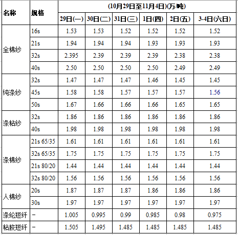 這周(10月29日-11月4日),全棉紗價(jià)格走勢偏弱,個(gè)別跌幅100-200元/噸左右,如32S價(jià)格就從上周初的23950元/噸跌到上周末的23800元/噸,J21S、32S依舊能夠保持一定銷售量,全棉/氨綸包芯紗(21S+40D)和(32S+40D)成交略有上升,彈力棉布面料銷售尚可。滌棉紗成交量不大,但80/2045S較動(dòng)銷,價(jià)格走勢穩(wěn)中調(diào)整狀態(tài)。滌粘紗40S/2交易量有升,價(jià)格維持平穩(wěn)狀態(tài)。由于受滌綸短纖下跌影響,對(duì)純滌紗缺乏支撐,本周報(bào)價(jià)下跌,成交量維持前期水平,45S、50S需求量與前幾天相比稍有放大,但其它規(guī)格交易量極少。人棉紗10S、30S需求量與前幾天相比稍有放大,其中30S主要是用于生產(chǎn)鉆石棉面料,但其它規(guī)格交易量極少,人棉紗價(jià)格走勢重心下移,粘膠短纖價(jià)格向下調(diào)整,均價(jià)14850噸左右。預(yù)計(jì)下周紗線行情還將有調(diào)整趨勢。