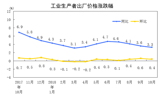 11月9日訊 據(jù)國家統(tǒng)計局網(wǎng)站消息,2018年10月份,全國工業(yè)生產(chǎn)者出廠價格同比上漲3.3%,環(huán)比上漲0.4%。工業(yè)生產(chǎn)者購進價格同比上漲4.0%,環(huán)比上漲0.7%。1-10月平均,工業(yè)生產(chǎn)者出廠價格比去年同期上漲3.9%,工業(yè)生產(chǎn)者購進價格上漲4.5%。