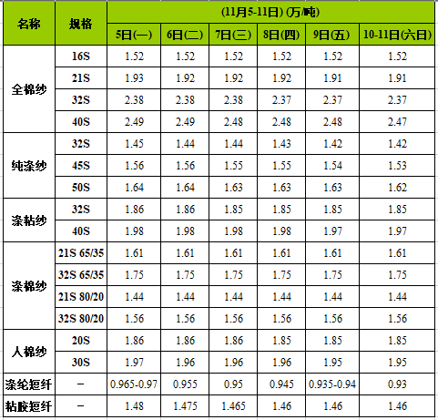 這周(11月5-11日),個別全棉紗報價繼續(xù)呈穩(wěn)中有落狀態(tài),且成交一般,32S、J40S銷量較好,其它銷售一般,但全棉/氨綸包芯紗(21S+40D)和(32S+40D)成交略有上升,主要是彈力棉布面料銷售尚好拉動。滌棉紗65/3545S交易量有升,滌棉紗價格維持平穩(wěn)偏弱狀態(tài)。滌粘紗65/35行情穩(wěn)定,滌粘紗價格重心下移。純滌紗價格行情呈下跌態(tài)勢,目前32S、45S銷量好于其他,滌綸短纖價格走勢震蕩下跌,1.4D×38mm中心價落在9300元/噸,預計下周純滌紗行情還將有下跌的趨勢。人棉紗系列行情一般,10S成交較多,人棉紗價格呈現(xiàn)下滑,粘膠短纖價格向下調(diào)整之中,中心價落在14550-14600元/噸之間。