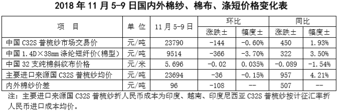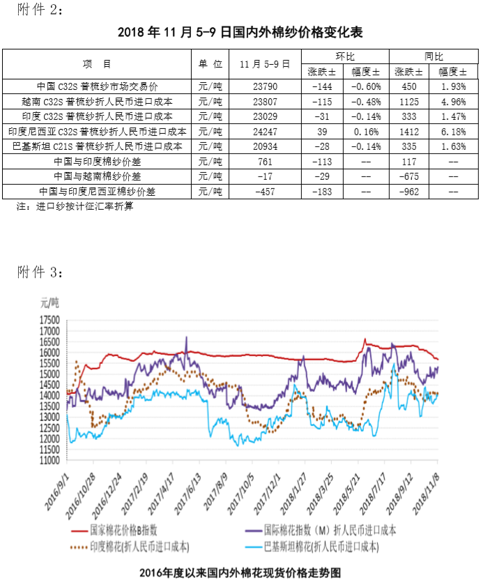 附件2:2018年11月5-9日國內外棉紗價格變化表