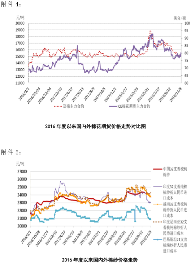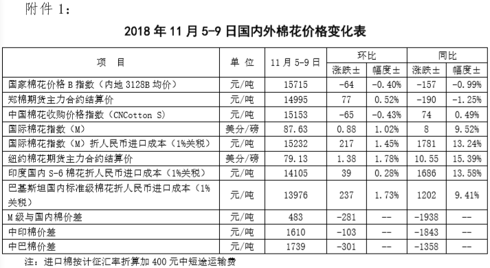 附件1:2018年11月5-9日國內外棉花價格變化表