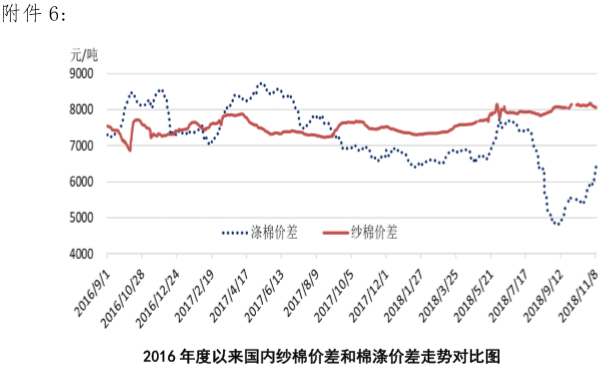 本周,美國民主黨奪回眾議院使美國政府處于分裂狀態(tài),導致美元指數(shù)一度大幅回落,及美國農業(yè)部(USDA)報告調減產量,支撐國際棉價整體上漲。2018年11月5-9日,紐約棉花期貨主力合約結算價79.13美分/磅,較上周上漲1.38美分/磅,漲幅1.78%;代表進口棉中國主港到岸均價的國際棉花指數(shù)(M)為87.63美分/磅,較上周上漲0.88美分/磅,漲幅1.02%,折人民幣進口成本15232元/噸,較上周上漲217元/噸,漲幅1.45%。內外棉價差483元/噸,較上周縮小281元/噸。