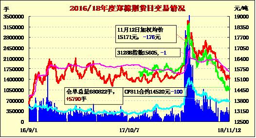 11月12日,隔夜鄭棉沖高下滑,今日早盤探低回升后盤整,日線形成小陰線。日內(nèi)成交量放大,持倉量增加。基本面情況:截至2018年11月11日,新疆棉花累計加工量230.5萬噸,同比減幅5.9%,其中,地方棉花加工量153.8萬噸,同比減幅4.3%,兵團棉花加工量76.7萬噸,同比減幅8.9%。當日加工量6.2萬噸。
