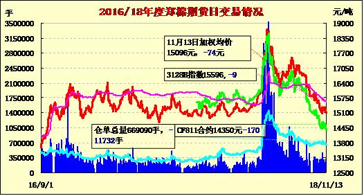 11月13日,隔夜鄭棉下滑,今日盤(pán)中在空頭回補(bǔ)推動(dòng)下反彈,日線(xiàn)形成小陰線(xiàn)。日內(nèi)成交清淡,持倉(cāng)量近減遠(yuǎn)增?;久媲闆r:海關(guān)總署最新數(shù)據(jù)顯示,2018年10月,我國(guó)出口紡織品服裝約232.566億美元,同比增加7.26%,環(huán)比減少12.60%。其中出口紡織紗線(xiàn)、織物及制品97.436億美元,同比增加6.08%,環(huán)比減少8.08%;出口服裝及衣著附件135.13億美元,同比增加8.13%,環(huán)比減少15.59%。2018年1-10月,我國(guó)累計(jì)出口紡織品991.11億美元,同比增加9.71%;累計(jì)出口服裝1327.78億美元,同比增加1.26%。