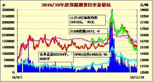 11月19日,隔夜鄭棉下試回升,今日早盤受外盤沖高乏力的影響放量回落,午后減倉收低,日線形成小陰線。日內(nèi)成交量萎縮,持倉量近減遠(yuǎn)增?;久媲闆r:2018年11月12日-11月18日,據(jù)全國棉花交易市場庫對庫新疆核查點(diǎn)統(tǒng)計,公路出疆棉運(yùn)輸量總計2.61萬噸,較前一周運(yùn)輸量增加0.09萬噸,同比減少2.0萬噸。期間公路運(yùn)輸量略有回升,周內(nèi)運(yùn)價穩(wěn)中有漲,部分路線運(yùn)價小幅上漲??瓦\(yùn)至河南省平均運(yùn)價約764元/噸,較前一周運(yùn)價基本持平;奎屯運(yùn)至山東省平均運(yùn)價約815元/噸,較前一周運(yùn)價上漲26元/噸;庫爾勒運(yùn)至河南省平均運(yùn)價約771元/噸,較前一周運(yùn)價上漲42元/噸,庫爾勒運(yùn)至山東省平均運(yùn)價約791元/噸,較前一周運(yùn)價上漲14元/噸。