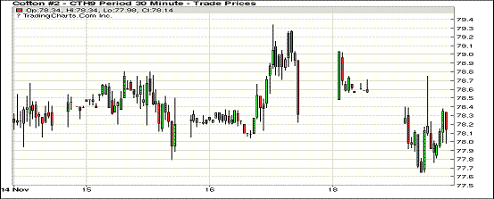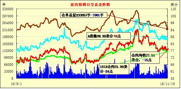 19日紐約期棉市場全面收跌。1812合約結(jié)算價(jià)75.88美分,跌24點(diǎn);1903合約結(jié)算價(jià)78.05美分,跌24點(diǎn);1905合約結(jié)算價(jià)79.32美分,跌23點(diǎn)。當(dāng)日3月合約高開低走,上半場受賣盤打壓持續(xù)走低,午盤后投機(jī)買盤入市促市場出現(xiàn)反彈,然最終難以抵消跌幅,最終小幅收跌。12月合約將于11月26日進(jìn)入第一交割通知日,受感恩節(jié)影響,紐約期棉市場將于周四閉市一天。外圍美元指數(shù)下跌,玉米、大豆和小麥期貨全面走跌。美股大跌,道指下挫400點(diǎn),標(biāo)普跌45.54點(diǎn),納指重挫超3%。