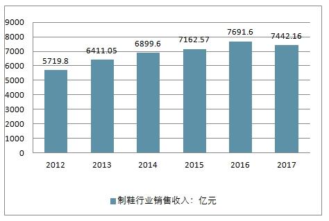 2012-2017年我國制鞋行業(yè)銷售收入走勢(單位:億元)