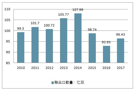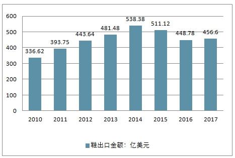 2017年我國鞋出口扭轉頹勢,出口數量和金額雙增長,全年出口鞋子數量達到96.43億雙,較上年增長3.77%;出口鞋子金額達到456.60億元,同比增長1.74%。