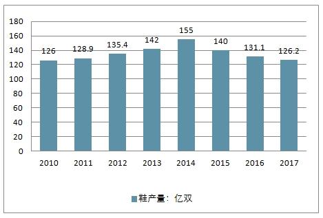 近兩年來,雖然我國鞋業(yè)產量占世界鞋業(yè)產量比重有所下滑,不過我國依舊是世界上最大的鞋類生產國。2016年,我國鞋產量達到131.1億雙,占世界比重達到57.0%,2017年我國鞋產量為126.2億雙。