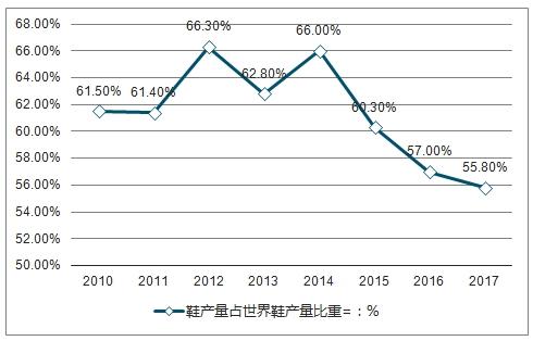 2010-2017年我國鞋產量占世界鞋產量比重情況走勢