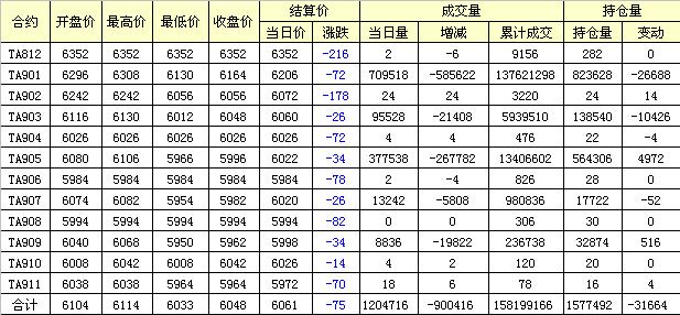主力TA901合約當日交易走勢