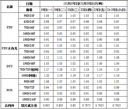 本周(11月19-25日),由于原油跌勢較大,聚酯原料成本面塌陷,滌綸長絲氣氛明顯淡,聚酯廠家報價連連下調(diào),幅度多在300-500元/噸之間,且優(yōu)惠促銷措施較普遍,成交量相比上周均有下降,聚酯工廠產(chǎn)銷率周平均多處于60-70%水平,個別紡絲工廠甚至更低,聚酯工廠滌綸長絲庫存量又有進一步上升。