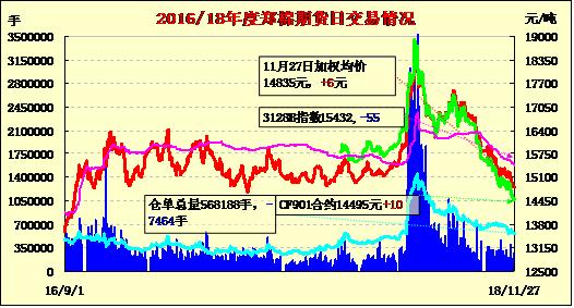 11月27日,隔夜鄭棉回升,今日早盤快速下滑,此后低位震蕩,尾盤收低,日線形成小陰線。日內成交量萎縮,持倉量近減遠增?;久媲闆r:受降雨天氣影響,美國多棉區(qū)棉花采摘進度出現延遲,對未采摘部分產量和質量的擔憂支撐期棉價格走高。此外,G20峰會即將召開,市場普遍期待中美貿易緊張局勢將通過會談有所緩和,提振棉花市場。