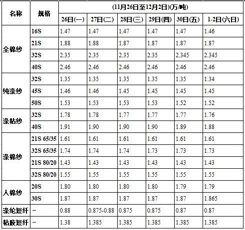 一周來(lái)(11月26日至12月2日),全棉紗價(jià)格持續(xù)下調(diào),J21S、32S動(dòng)銷(xiāo),全棉/氨綸包覆紗(21S+40D)和(32S+40D)成交略有回升,主要是彈力棉布類(lèi)面料銷(xiāo)售仍有動(dòng)量。滌棉紗價(jià)格行情呈偏弱調(diào)整態(tài)勢(shì)。滌粘紗行情呈均有小幅度下跌,滌粘紗40S/2交易量有升。純滌紗價(jià)格呈現(xiàn)弱勢(shì)下滑狀態(tài),銷(xiāo)售一般,相比之下45S較順暢,上游原料滌綸短纖價(jià)格有所下調(diào),1.4D×38mm中心價(jià)落在8700元/噸左右。人棉紗價(jià)格穩(wěn)中有落,相比之下10S動(dòng)銷(xiāo)量,主要下游織造用于生產(chǎn)錦綸人棉羅緞面料,粘膠短纖價(jià)格震蕩偏堅(jiān)挺調(diào)整,均價(jià)13850元/噸左右,預(yù)計(jì)下周人棉紗行情還將有適度調(diào)整趨勢(shì)。
