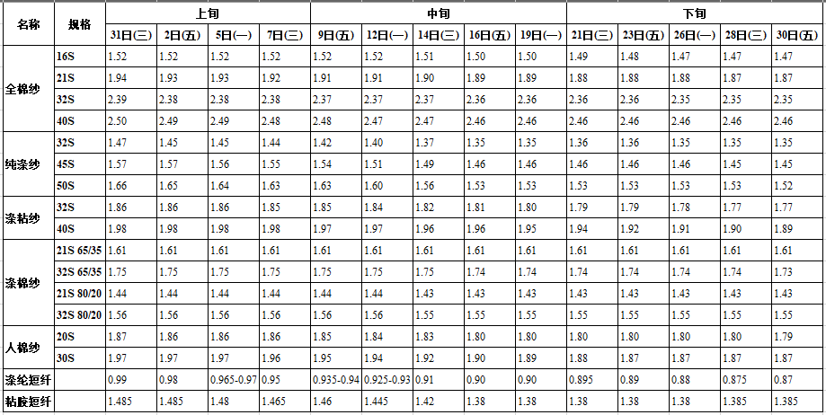 第五周:(11月26日至12月2日)這一周,全棉紗價(jià)格持續(xù)下調(diào),J21S、32S動(dòng)銷,全棉/氨綸包覆紗(21S+40D)和(32S+40D)成交略有回升,主要是彈力棉布類面料銷售仍有動(dòng)量。滌棉紗價(jià)格行情呈偏弱調(diào)整態(tài)勢(shì)。滌粘紗行情呈均有小幅下跌,滌粘紗40S/2交易量有升。純滌紗價(jià)格呈現(xiàn)弱勢(shì)下滑狀態(tài),銷售一般,相比之下45S行情較順暢,上游原料滌綸短纖價(jià)格有所下調(diào),1.4D×38mm中心價(jià)落在8700元/噸左右。人棉紗價(jià)格穩(wěn)中有落,相比之下10S動(dòng)銷量,主要下游織造用于生產(chǎn)錦綸人棉羅緞面料,粘膠短纖價(jià)格震蕩偏堅(jiān)挺調(diào)整,均價(jià)13850元/噸左右,預(yù)計(jì)下周人棉紗行情還將有適度調(diào)整趨勢(shì)。