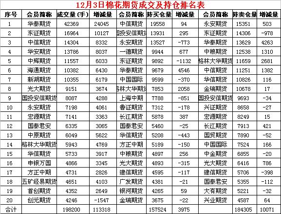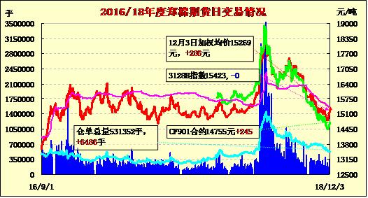 12月3日,隔夜鄭棉盤整,今日早盤受到中美兩國元首會晤的利好消息推動放量沖高,午后受到空頭賣盤壓制下滑,日線形成長上影線的陽線。日內(nèi)成交量放大,持倉量近減遠(yuǎn)增?;久媲闆r:信息員調(diào)查了解,安徽省不同規(guī)模紡織企業(yè)普遍反映,往年“金九銀十”行情在今年沒有出現(xiàn),十一月份是淡季特征明顯。突出地表現(xiàn)在純棉紗銷路不暢、下游拿貨不積極且價(jià)格陰跌。近期一些棉紡織廠純棉40支普梳價(jià)格已跌破24000元/噸,甚至低到23600元/噸。因此不少棉紡織廠棉紗庫存較上月上升,最多的達(dá)到了近一個(gè)月棉紗生產(chǎn)量。