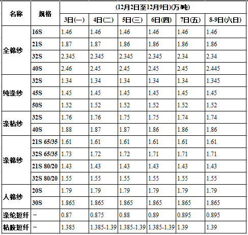 這一周,全棉紗整體行情處在銷量平穩(wěn)態(tài)勢,但極個別報價穩(wěn)中有降,如21S價格有100元/噸下降,J21S、J32S銷量小幅上升,另外32S全棉+40D氨綸包覆紗下游需求量有升,主要用于生產(chǎn)彈力錦棉布。滌棉紗成交量不大,65/35價格行情呈現(xiàn)盤跌態(tài)勢。滌粘紗40S/2交易量繼續(xù)上升,價格走勢略微下調(diào)。純滌紗32S、45S需求穩(wěn)中有升,價格走勢處于調(diào)整狀態(tài),目前價格分別13450元/噸、14500元/噸左右,滌綸短纖目前中心價8950元/噸左右。人棉紗10S、30S較走俏,價格保持暫平穩(wěn)狀態(tài),粘膠短纖價格處在調(diào)整,中心價位13900元/噸左右。預(yù)計下周紗線行情將以調(diào)整行情為主。