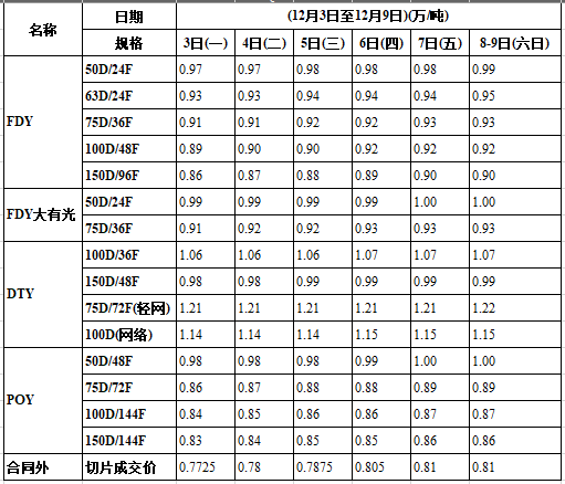 受中美貿(mào)易戰(zhàn)緩和及油價延長減產(chǎn)等利好因素,再加聚酯工廠滌綸長絲處于虧損狀態(tài),在多種利好帶動下,下游采購熱情釋放,滌綸長絲行情出現(xiàn)止跌反彈,這一周價格走勢有200-300元/噸上漲,個別甚至有400元/噸上漲,周一平均產(chǎn)銷高達(dá)400%左右,部分工廠甚至達(dá)600%,但雙休日回落60-80%,這一周產(chǎn)銷整體平均180%左右,聚酯工廠滌綸長絲庫存明顯回落。