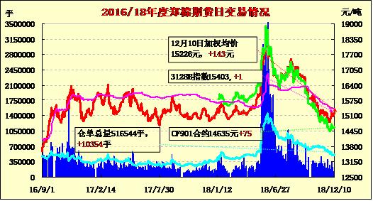 12月10日,隔夜鄭棉探震蕩上行,今日早盤增倉(cāng)上沖后調(diào)整,日線形成小陽(yáng)線。日內(nèi)成交量放大,持倉(cāng)量增加?;久媲闆r:截止到2018年12月09日24點(diǎn),2018棉花年度全國(guó)共有944家棉花加工企業(yè)按照棉花質(zhì)量檢驗(yàn)體制改革方案的要求加工棉花并進(jìn)行公證檢驗(yàn),檢驗(yàn)量達(dá)到15486465包,349.7824萬(wàn)噸。其中新疆: 740家加工企業(yè),公證檢驗(yàn)達(dá)14796858包,334.2929萬(wàn)噸。內(nèi)地: 204家加工企業(yè),公證檢驗(yàn)達(dá)689607包,15.4895萬(wàn)噸。