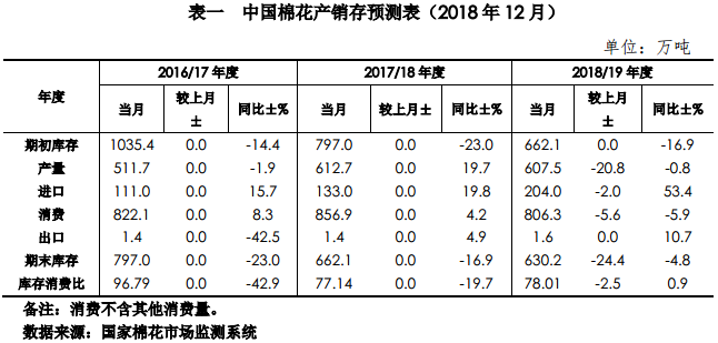 據(jù)國家棉花市場(chǎng)監(jiān)測(cè)系統(tǒng)2018/19年度棉花產(chǎn)量調(diào)查結(jié)果,本期平衡表將2018/19年度棉花產(chǎn)量調(diào)減20.8萬噸至607.5萬噸,進(jìn)口量調(diào)減2萬噸至204萬噸,消費(fèi)量調(diào)減5.6萬噸至806.3萬噸,期末庫存調(diào)減24.4萬噸至630.2萬噸(詳見下表)。