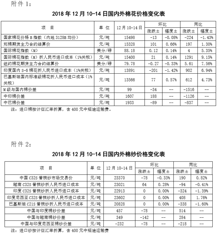附件1:2018年12月10-14日國(guó)內(nèi)外棉花價(jià)格變化表