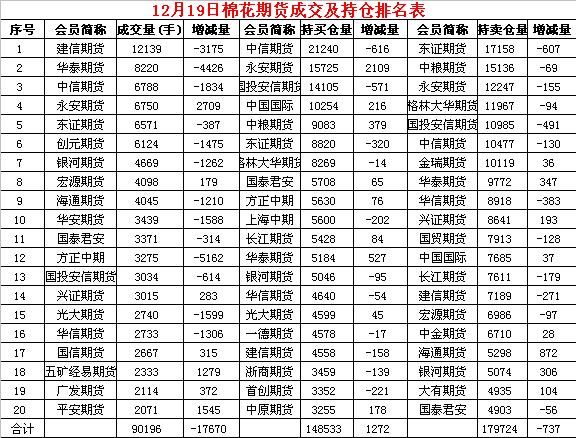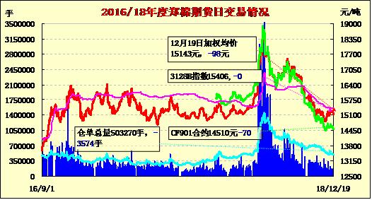 12月19日,隔夜鄭棉沖高回落,今日盤(pán)中低位震蕩,日線形成小陰線。日內(nèi)成交量萎縮,持倉(cāng)量小幅增加?;久媲闆r:截至2018年12月18日,新疆棉花累計(jì)加工量423.9萬(wàn)噸,同比減幅2.1%,其中,地方棉花加工量288.2萬(wàn)噸,同比減幅1.0%,兵團(tuán)棉花加工量135.7萬(wàn)噸,同比減幅4.2%。當(dāng)日加工量4.2萬(wàn)噸。