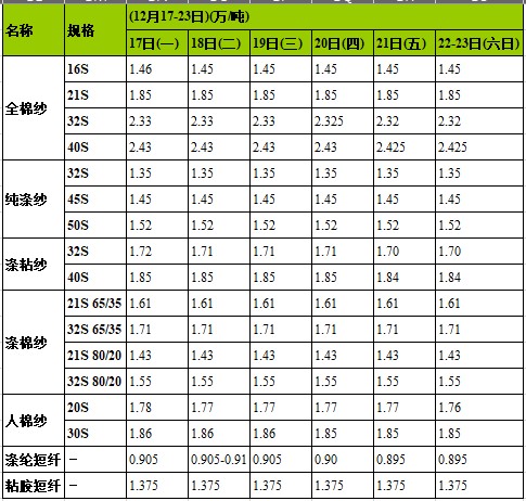 這周,全棉紗價(jià)格偏弱運(yùn)行,近期銷售不力,商家以出貨為主,相對(duì)32S高配、J21S走貨尚可,60S動(dòng)銷量略有放大,還有包覆紗32S全棉+40D氨綸較動(dòng)銷,主要用于錦棉彈力布生產(chǎn),全棉精梳銷售較顯一般。滌棉紗65/3580/2032S45S價(jià)格走勢(shì)均穩(wěn)定狀態(tài)。滌粘紗(65/35)32S/2需求抬升,主要用于生產(chǎn)TR條子導(dǎo)電布,滌粘紗價(jià)格走勢(shì)穩(wěn)中下調(diào)。純滌紗價(jià)格平穩(wěn)走勢(shì),商家反映純滌紗45S銷量稍大些,目前滌綸短纖價(jià)格走勢(shì)略顯疲軟,中心價(jià)8950元/噸左右,預(yù)計(jì)下周純滌紗行情將有下行趨勢(shì)。部分人棉紗價(jià)格仍有下調(diào),10S銷量好于其他,粘膠短纖價(jià)格處于調(diào)整之中,均價(jià)13750元/噸左右,預(yù)計(jì)后市人棉紗將繼續(xù)呈調(diào)整態(tài)勢(shì)。