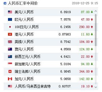 中國(guó)人民銀行授權(quán)中國(guó)外匯交易中心公布,2018年12月25日銀行間外匯市場(chǎng)人民幣匯率中間價(jià)為:1美元對(duì)人民幣6.8919元,1歐元對(duì)人民幣7.8576元,100日元對(duì)人民幣6.2456元,1港元對(duì)人民幣0.87983元,1英鎊對(duì)人民幣8.7542元,1澳大利亞元對(duì)人民幣4.8569元,1新西蘭元對(duì)人民幣4.6421元,1新加坡元對(duì)人民幣5.0184元,1瑞士法郎對(duì)人民幣6.9845元,1加拿大元對(duì)人民幣5.0658元,人民幣1元對(duì)0.60707馬來西亞林吉特,人民幣1元對(duì)9.9505俄羅斯盧布,人民幣1元對(duì)2.1151南非蘭特,人民幣1元對(duì)163.11韓元,人民幣1元對(duì)0.53293阿聯(lián)酋迪拉姆,人民幣1元對(duì)0.54441沙特里亞爾,人民幣1元對(duì)40.9014匈牙利福林,人民幣1元對(duì)0.54567波蘭茲羅提,人民幣1元對(duì)0.9501丹麥克朗,人民幣1元對(duì)1.3132瑞典克朗,人民幣1元對(duì)1.2695挪威克朗,人民幣1元對(duì)0.76732土耳其里拉,人民幣1元對(duì)2.8837墨西哥比索,人民幣1元對(duì)4.7210泰銖。