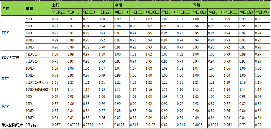 從月底市況分析:雖下游布市交易處在淡季狀態(tài),但PTA、MEG價格屬于底部震蕩調(diào)整,部分滌綸長絲進入處于邊際和微虧面上,考慮到春節(jié)走近因素,聚酯工廠滌綸長絲出貨較強,因此1月滌綸長絲也不排除絲價有小范圍調(diào)整行情,但下游有年前備料跡象,因此聚酯工廠拋售優(yōu)惠出貨趨勢,成交量將有上升態(tài)勢,滌綸長絲價格漲跌最終取決于原料市場變化。