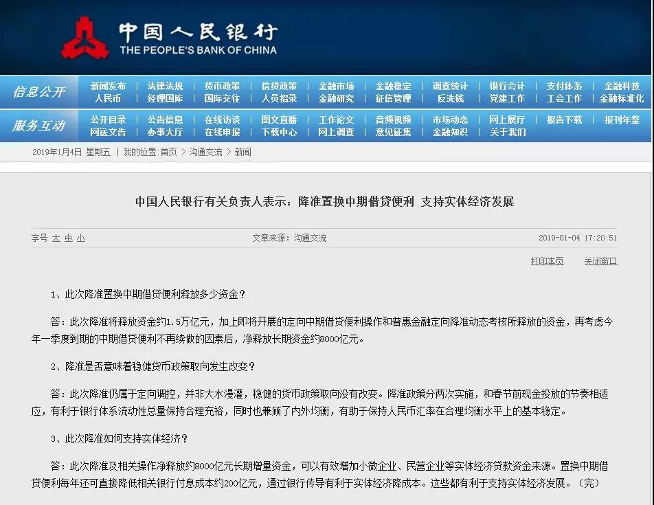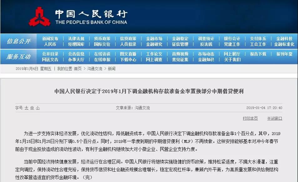 為進(jìn)一步支持實(shí)體經(jīng)濟(jì)發(fā)展,優(yōu)化流動(dòng)性結(jié)構(gòu),降低融資成本,中國人民銀行決定下調(diào)金融機(jī)構(gòu)存款準(zhǔn)備金率1個(gè)百分點(diǎn),其中2019年1月15日和1月25日分別下調(diào)0.5個(gè)百分點(diǎn)。同時(shí),2019年1季度到期的中期借貸便利(MLF)不再續(xù)做。這樣安排能夠基本對(duì)沖今年春節(jié)前由于現(xiàn)金投放造成的流動(dòng)性波動(dòng),有利于金融機(jī)構(gòu)繼續(xù)加大對(duì)小微企業(yè)、民營企業(yè)支持力度。