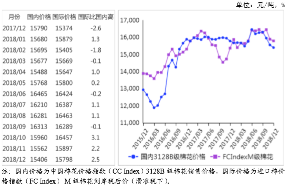(二)國際棉價(jià)震蕩下跌。本月上旬,G20峰會中美首腦會晤的利好支撐國際棉價(jià)整體上漲。中旬,美國農(nóng)業(yè)部12月月報(bào)預(yù)測調(diào)減全球棉花產(chǎn)量和消費(fèi)量,國際棉價(jià)弱勢振蕩。下旬,受美聯(lián)儲加息以及美墨邊境墻之爭影響,美國金融市場重挫,國際棉價(jià)隨之下跌。12月,CotlookA指數(shù)(相當(dāng)于國內(nèi)3128B級棉花)月均價(jià)每磅86.00美分,環(huán)比跌0.9%,同比漲1.0%。