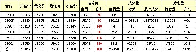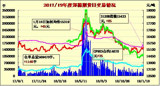 1月18日,隔夜鄭棉盤升,今日早盤在多頭買盤推動下上漲,午后調(diào)整,日線形成星線。日內(nèi)成交量萎縮,持倉量變化不大。基本面情況:周四印度S-6價格走低,但旁遮普邦J-34價格稍有上漲,軋花廠提貨價分別在42750盧比/坎地和4415盧比/莫恩德,折76.45美分/磅和75.20美分/磅。當(dāng)日新花上市開始恢復(fù),在13.15萬包(2.24噸),其中馬邦上市3.5萬包(5950噸),古吉拉特上市3.2萬包(5440噸),安得拉邦和北部地區(qū)均上市了2.1萬包(3570噸)。