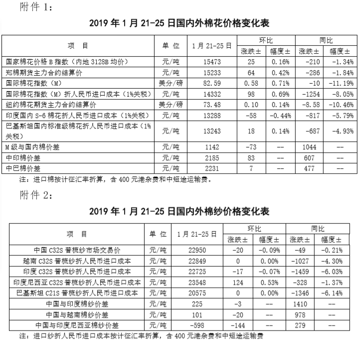 附件1:2019年1月21-25日國內(nèi)外棉花價格變化表