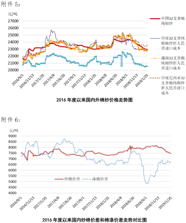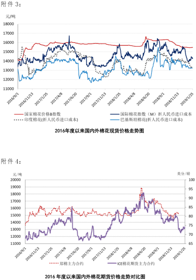 春節(jié)前國內(nèi)棉價或趨于平穩(wěn)。2018年12月紡織品服裝出口額呈現(xiàn)雙降局面,國內(nèi)限額以上服裝鞋帽、針紡織品類零售額同比放緩2.3個百分點,2018年四季度紡織產(chǎn)能利用率下降至77.4%,第一至三季度產(chǎn)能利用率分別為80.7%、81.3%、79.9%,行業(yè)運行存在壓力,隨著央行降準(zhǔn)、減稅降費等宏觀政策的實施,利于企業(yè)渡過難關(guān)?;久嫔?,據(jù)國家棉花市場監(jiān)測系統(tǒng)數(shù)據(jù)顯示,截至2019年1月25日,全國新棉累計加工573萬噸(總產(chǎn)按607.5萬噸測算),累計銷售皮棉210萬噸,同比減少37萬噸,較過去四年均值減少50萬噸,鄭棉倉單從9月初的45萬噸增加至65萬噸,周內(nèi)增加2.8萬噸,是上年同期的3.2倍,其中陳棉倉單10.9萬噸(占比16.6%),去年同期陳棉僅占7.3%,大量倉單施壓現(xiàn)貨市場,鄭棉價格上漲未帶動現(xiàn)貨市場同步上漲;隨著年關(guān)將至,物流逐漸停運,下游紡企春節(jié)前原料補(bǔ)庫基本結(jié)束,棉紗小量清貨,部分純棉布市場停滯,企業(yè)相繼進(jìn)入放假階段,主要以回款為主。預(yù)計春節(jié)前國內(nèi)棉價趨于平穩(wěn)為,市場關(guān)注點轉(zhuǎn)向國際市場,寄希望于春節(jié)后行情。