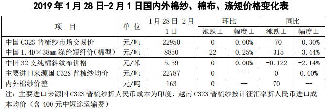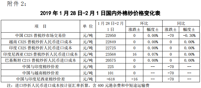 附件2:2019年1月28日-2月1日國內(nèi)外棉紗價(jià)格變化表