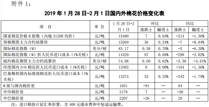 附件1:2019年1月28日-2月1日國內(nèi)外棉花價(jià)格變化表
